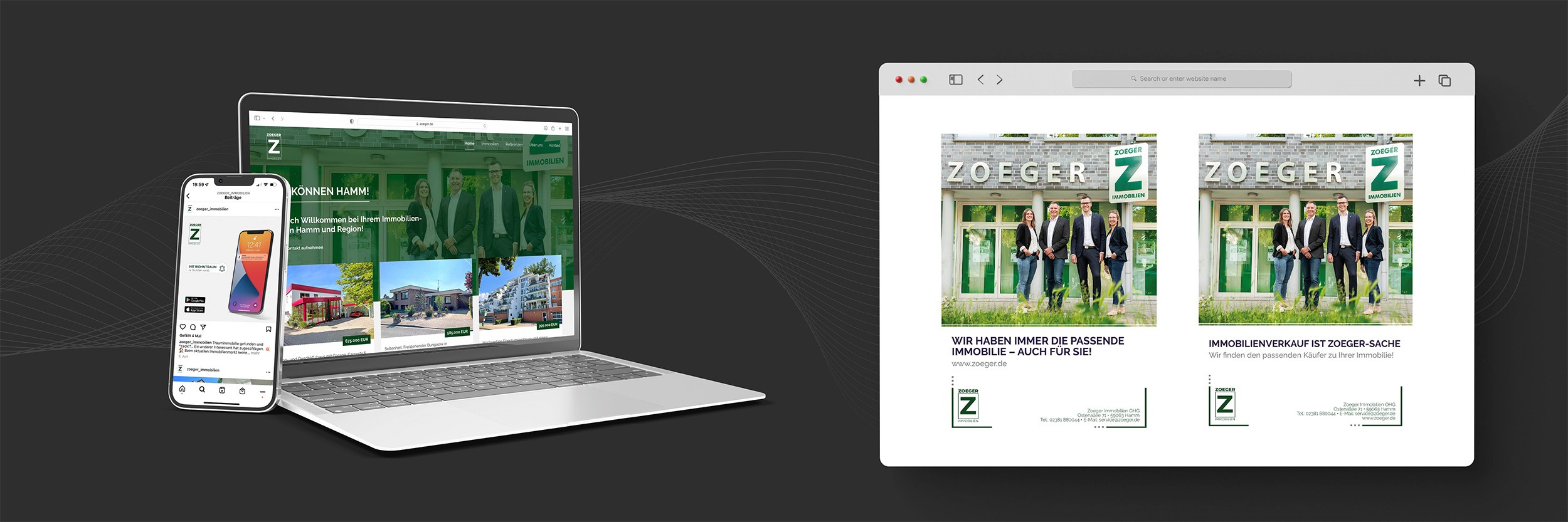 Wenn es um Einfamilien- und Mehrfamilienhäuser, Eigentumswohnungen, Gewerbeimmobilien, Kapitalanlagen oder Grundstücke geht, treffen Sie mit Zoeger Immobilien in Hamm und Umgebung immer die richtige Wahl. Seit 2020 betreut das PBM-Team den in Hamm ansässigen und bekannten Immobilienmakler ganzheitlich im Marketing. Auch Zoeger Immobilien entschied sich 2020 für die beliebte Gessamtbetreuung – dem kompromisslosen Komplettpaket. Dadurch wird auf alle Leistungen rund um die Bereiche Webdesign, Design, Foto- und Filmaufnahmen und Social Media zurückgegriffen.